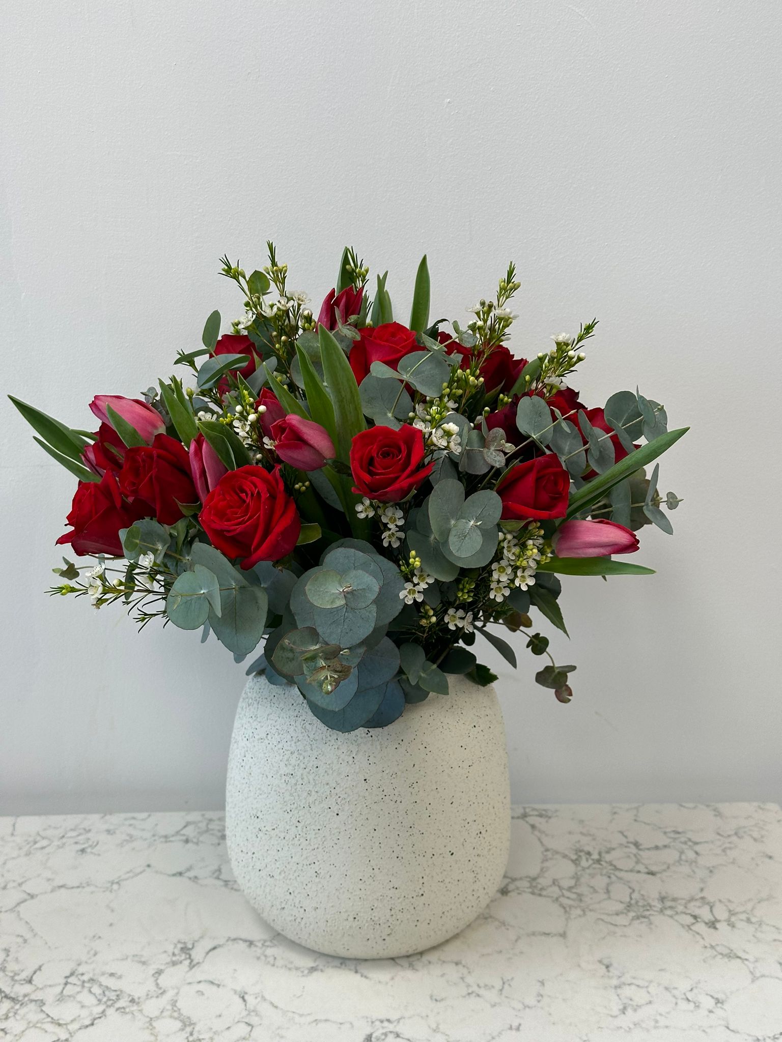 סידור פרחים מטוליפים וורדים בשילוב ירק עונתי בכלי קרמיקה