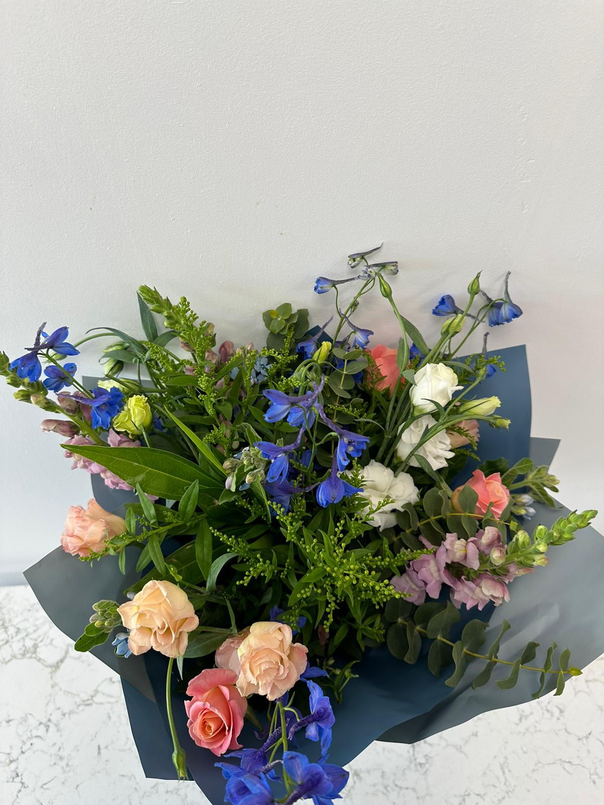 זר דולפניום ששזור מורדים, ליזאנטוס, דולפניום בשילוב ירק עונתי