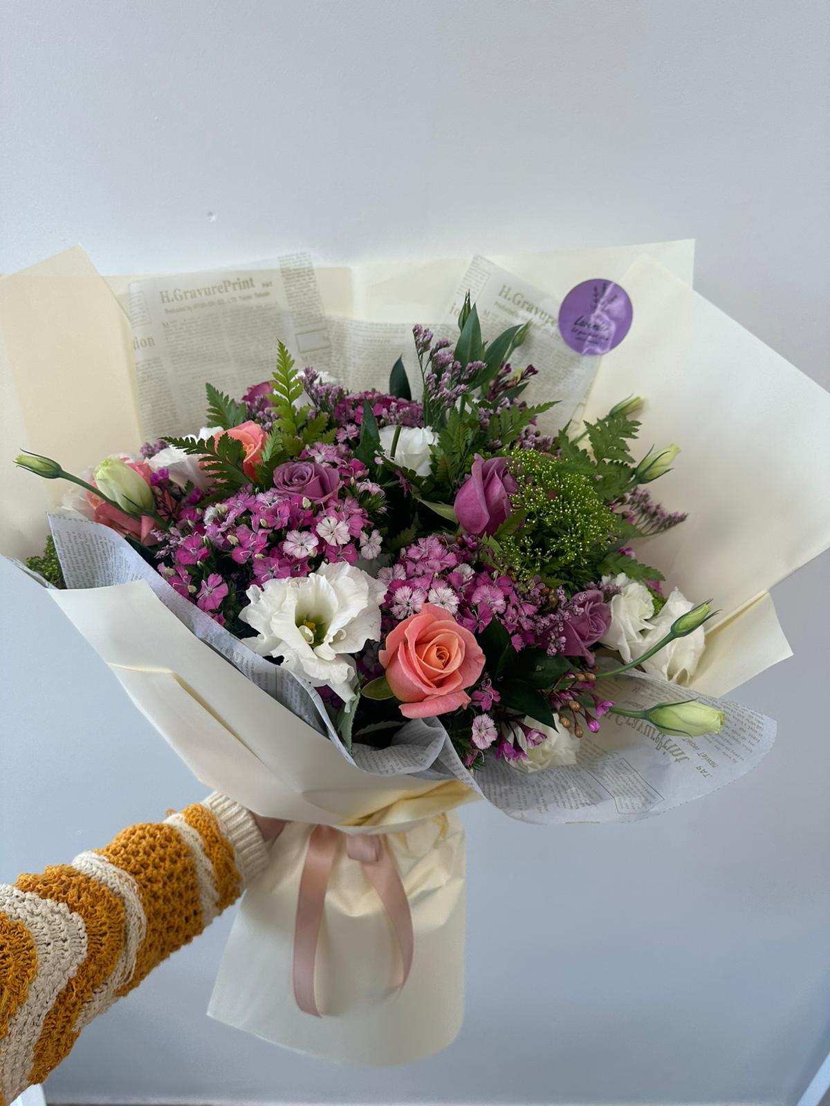 זר ורוד צפוף ששזור מסיני, ורדים, ליזאנטוס וירק עונתי
