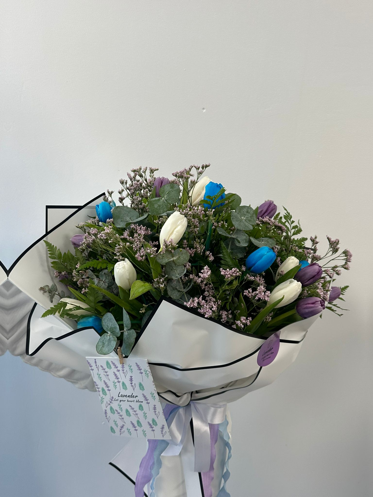 זר 30 טוליפים צבעוניים בשילוב ירק