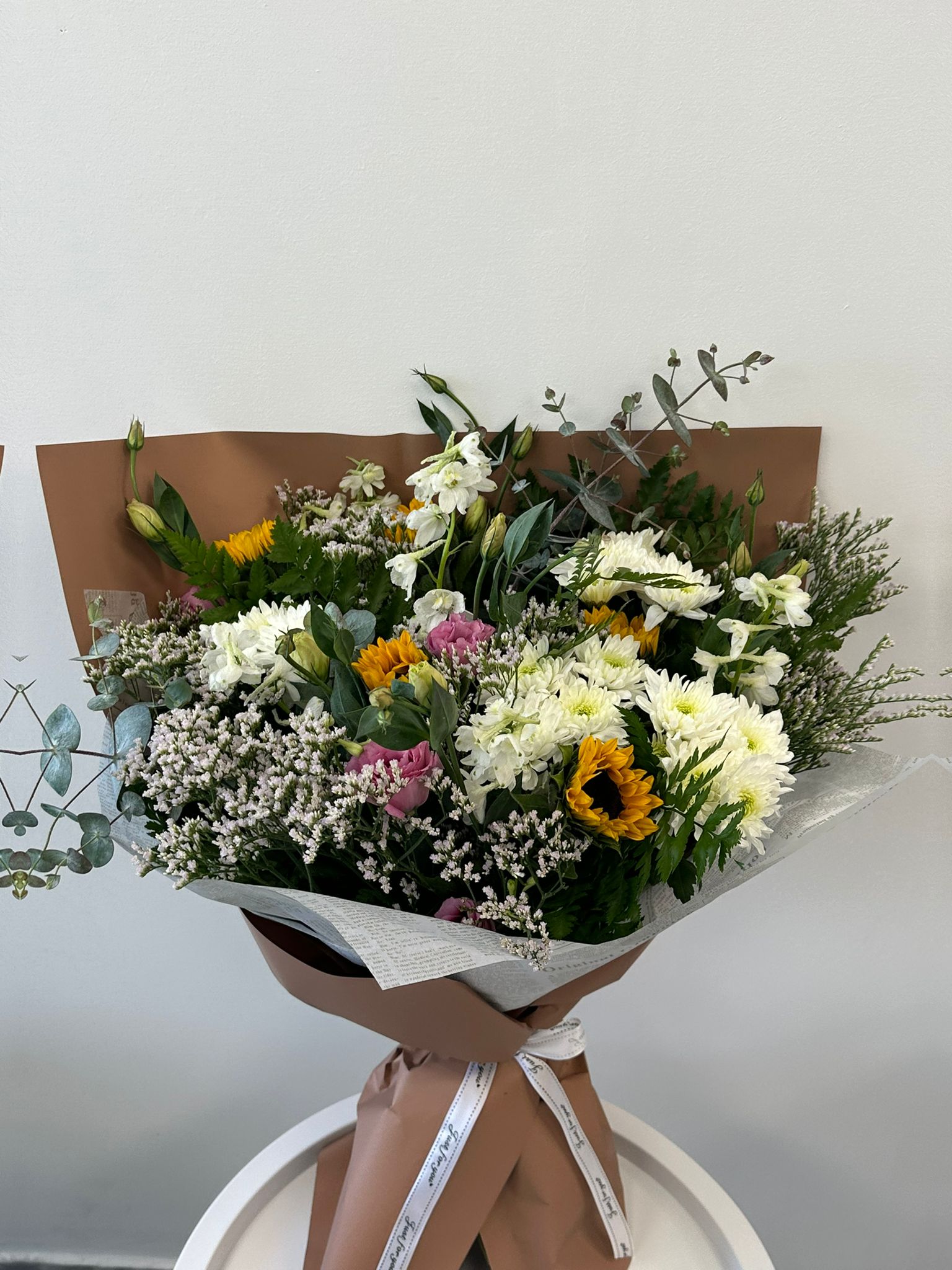 זר כפרי ששזור מחמניות, חרציות, ליזיאנטוס בשילוב ירק עונתי.