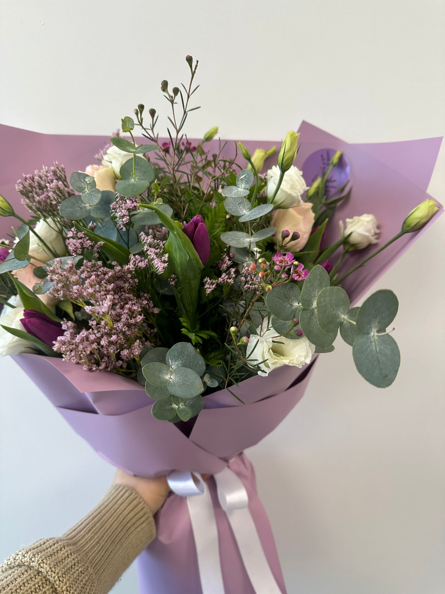 זר סגלגל ששזור מטוליפים,ורדים ליזאנטוס בשילוב ירק עונתי