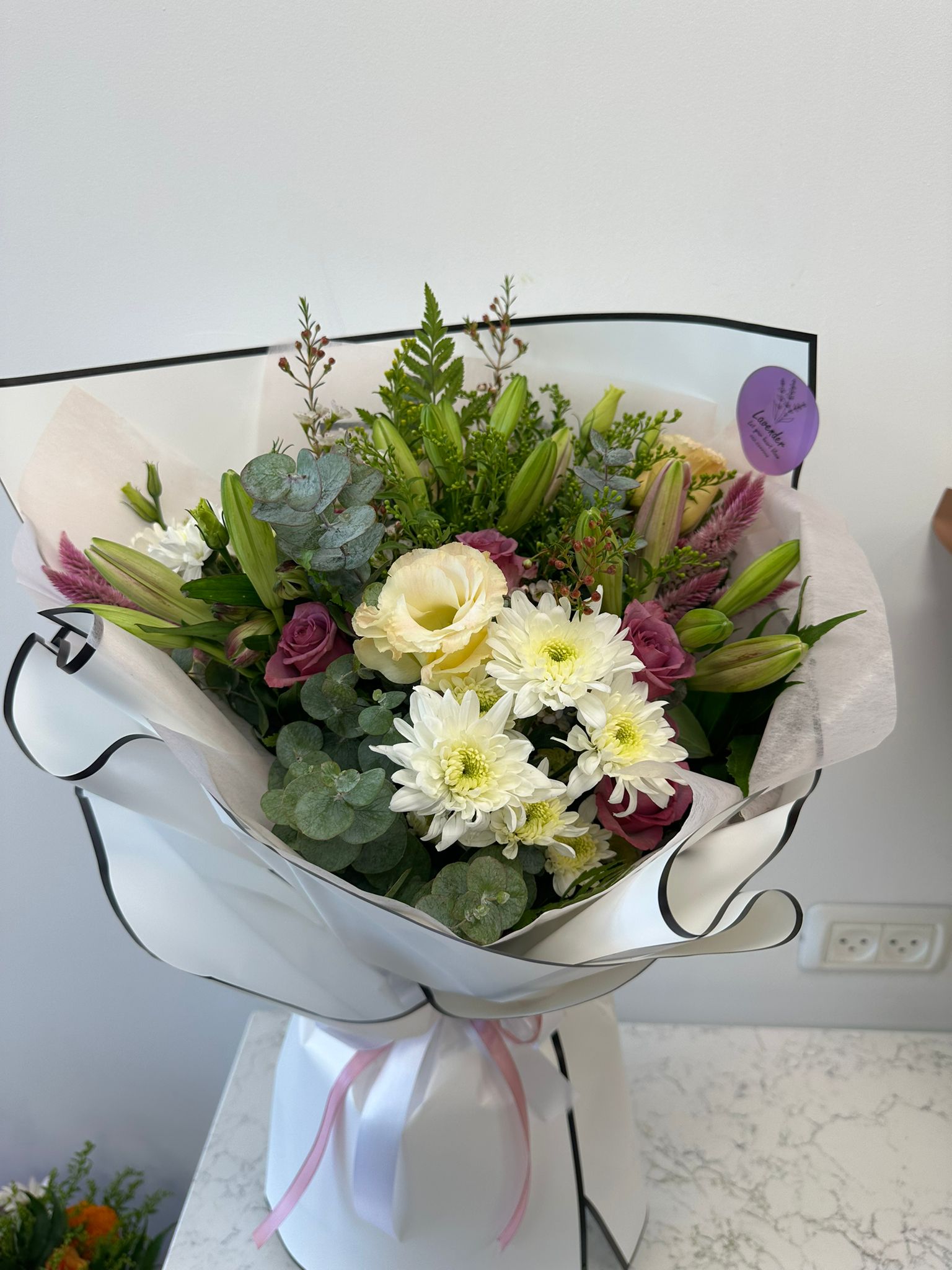 זר סינדרלה ששזור מחרצית, ורדים, ליזאטנוס בשילוב ירק עונתי