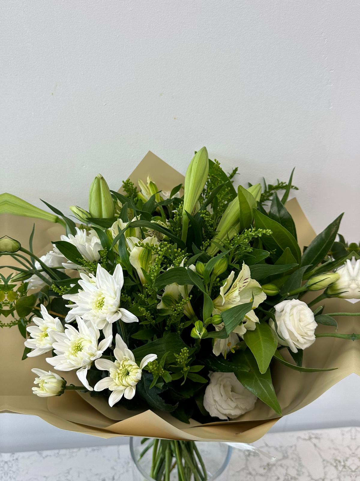 זר קלאסי לבן ששזור משושן צחור, חרציות, אסטרומריה, ליזאנטוס בשילוב ירק עונתי.