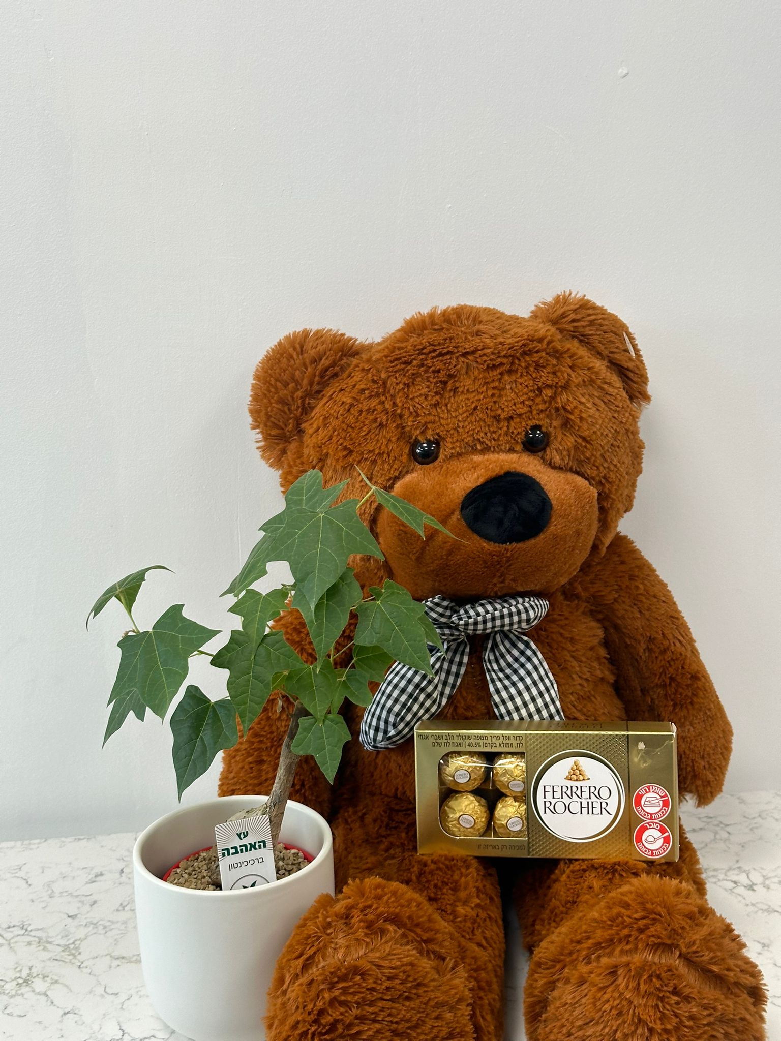 מארז שכולל עציץ אהבה קטן, מארז פררו הורשה ודובי חצי מטר