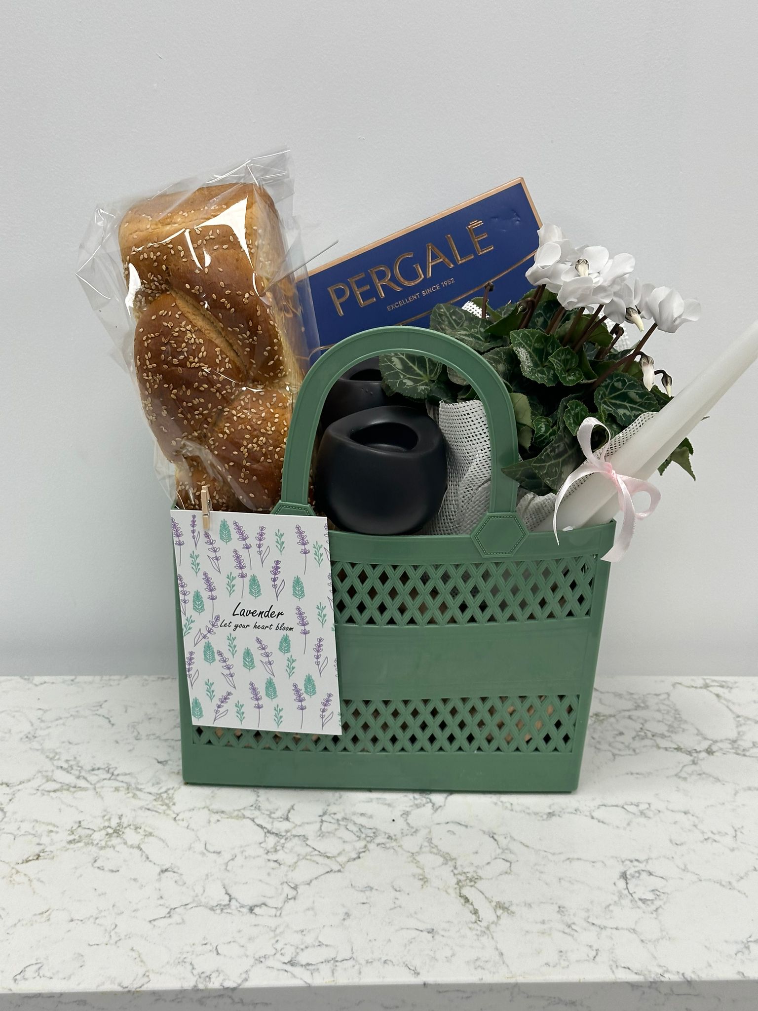 מארז שכולל סלסלה, מארז פרלינים, עציץ, זוג פמוטים וזוג נרות