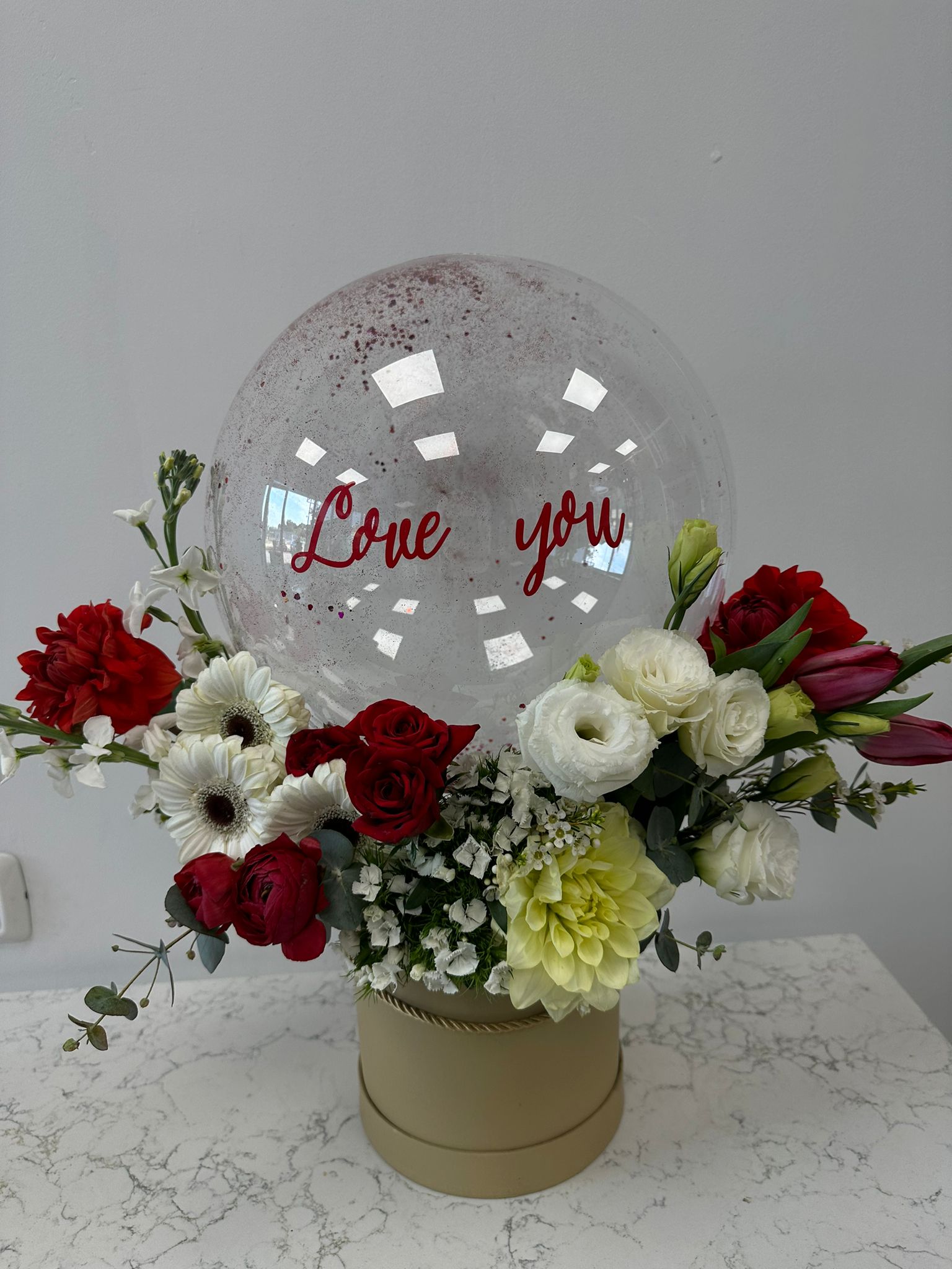 סידור פרחים בשילוב בלון ששזור מגרברות, דליה, ליזאנטוס, גיפסי, נוריות