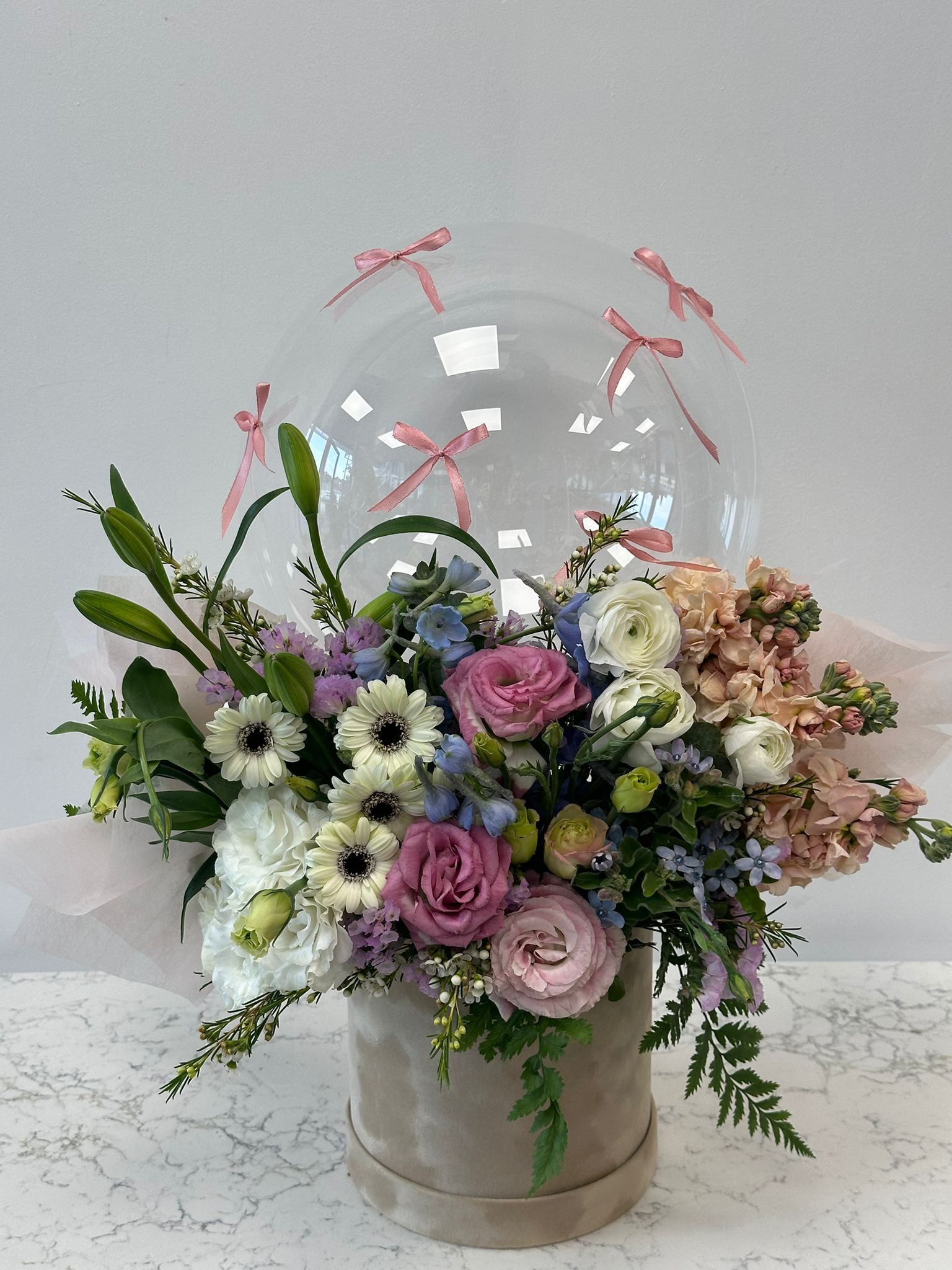קופסאת פרחים בשילוב בלון ששזורה מגרברות, דולפניום, ליזאנטוס, ליליות, מנטור בשילוב ירק עונתי.
